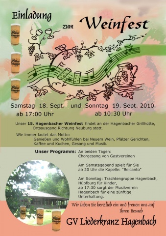 Der Gesangverein Liederkranz e.V. Hagenbach lädt alle Bürgerinnen und Bürger zu seinem diesjährigen Herbstfest mit dem Motto "Wein und Gesang" recht herzlich ein. Das Fest findet am 18. und 19. September an der Hagenbacher Grillhütte statt. Ein abwechslungsreiches Programm, herzhafte Speisen und belebende Getränke laden zum Verweilen in geselliger Runde ein.